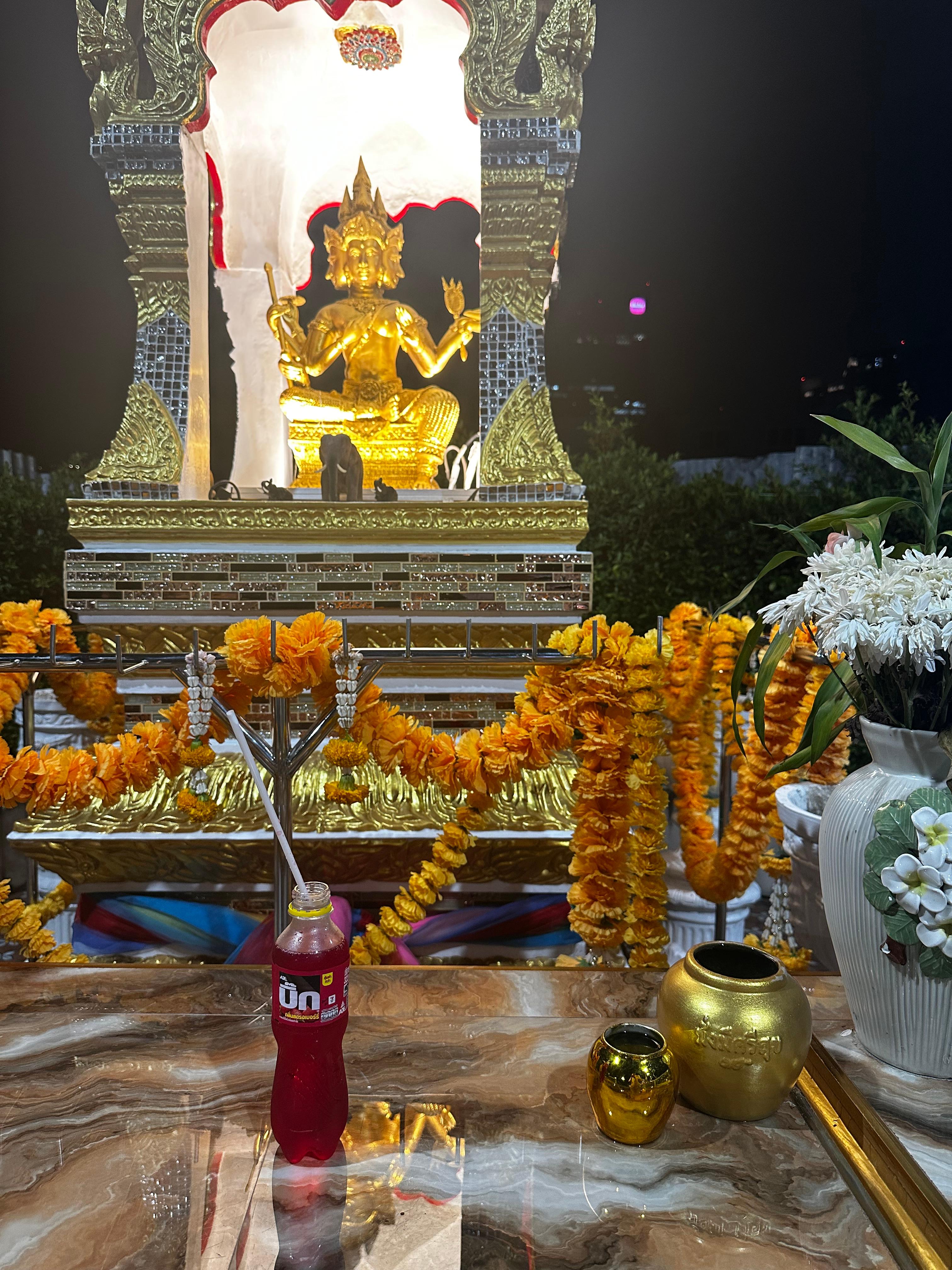 야시장에서 돌아오는 길은 늘 비슷했지만, 어느 날부터 아파트 입구에서는 발걸음이 자동으로 늦춰졌다. 낮에는 안내판과 경비실 사이에 숨은 장식처럼만 보이던 작은 제단이, 해가 떨어지면 전혀 다른 공간이 되었다. 유리 타일까지 잔잔하게 번지는 조명, 네 방향을 향해 앉아 있는 금빛 조각상, 겹겹이 걸린 주황색 마리골드 꽃목걸이, 그리고 바람이 스치면 짧게 울리는 작은 방울 소리. 지나가던 사람들도 오래 머무르진 않았다. 오토바이 헬멧을 벗어 들고 두 손을 모은 뒤, 금빛 항아리 옆에 무엇인가를 올려두고 곧 다시 각자의 밤으로 돌아갔다. 가까이 다가가 보고서야 그 ‘무엇’이 붉은색 음료라는 걸 알았다. 대부분 뚜껑이 열려 있고 빨대가 꽂혀 있었는데, 새 삼각김밥 포장을 뜯는 소리, 배달 앱 알림의 짧은 진동, 타이어가 젖은 바닥을 스치는 소리와 함께 그 빨간 병들이 묵묵히 자리를 지키고 있었다. “왜 빨대를 꽂아 두지?” 궁금증을 참지 못하고 경비 아저씨에게 조심스레 물었다. 아저씨는 어깨를 한번 으쓱하고는, “달고 향이 진하니까요. 오늘 무사했던 마음, 내일도 잘 부탁한다는 마음을 이렇게 올려두는 거예요”라고 짧게 답했다. 긴 강의보다 그 한마디가 더 또렷했다. 이 도시에선 하루의 끝마다 ‘수고했다’는 말을 이렇게 남기는구나. 낯섦이 예의로 바뀌는 데는 생각보다 많은 시간이 필요하지 않았다. 나는 그 자리에서 한 번 크게 숨을 들이켰다. 한국에서 배운 적 없는 ‘멈춰 서는 법’을, 여기서는 이렇게 간단한 동작으로 익힐 수 있다는 게 신기했다.